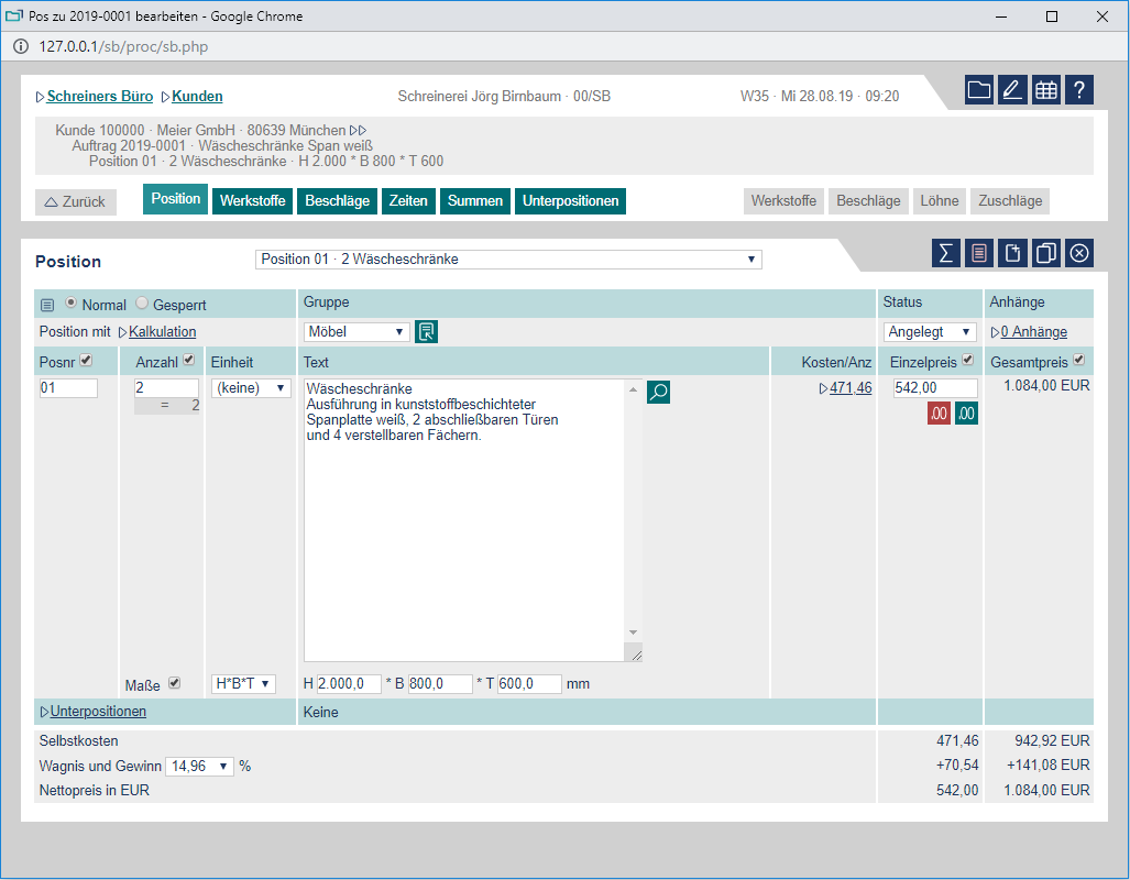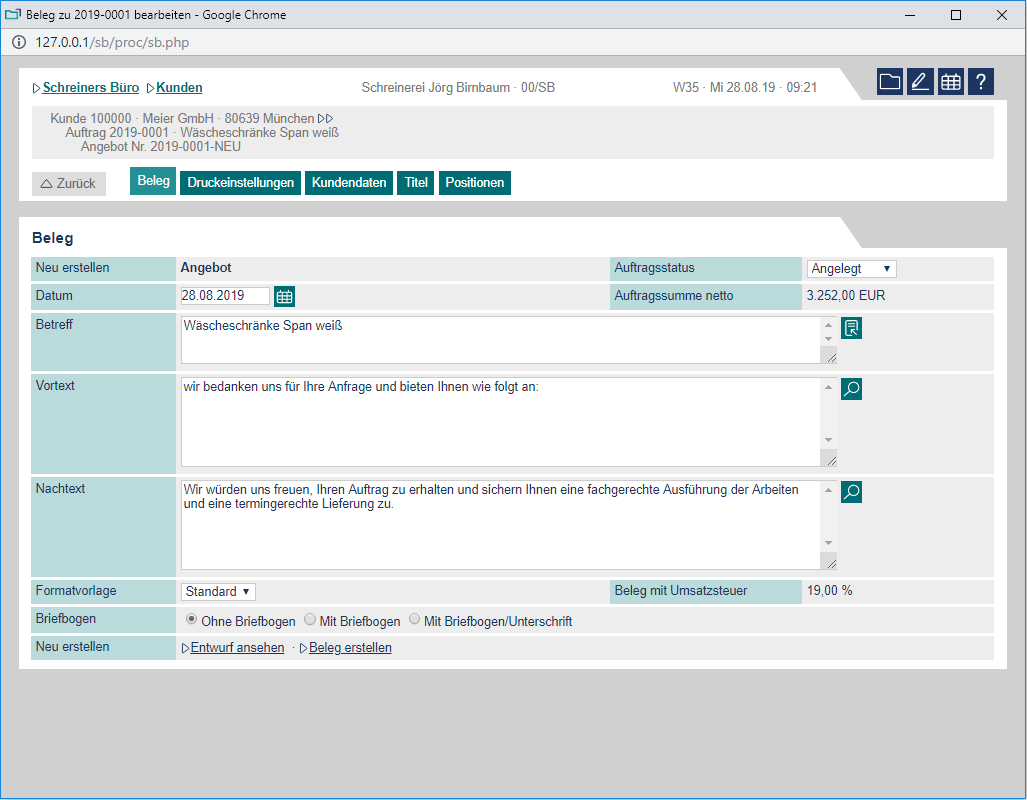 Schreiners Büro läuft direkt in Ihrem Browser. Hier können Sie sich Schreiners Büro als voll funktionsfähige Demo ansehen und in allen Funktionen (Angebot bis Rechnung, Zeiten buchen, Kalkulation usw.) ausgiebig testen.